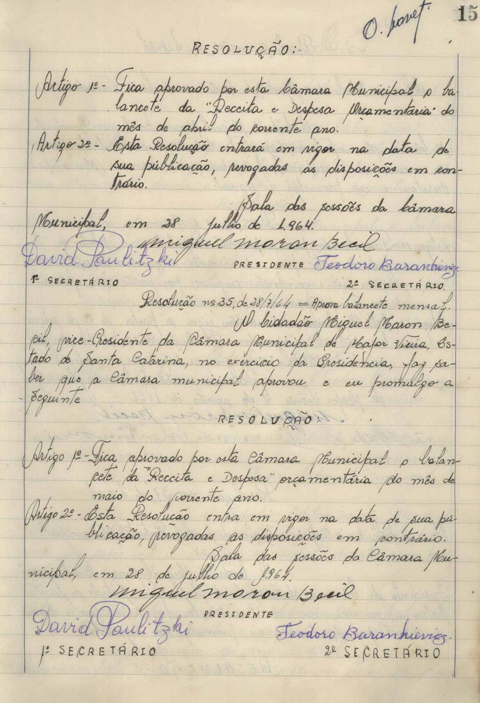 APROVA BALANCETE DA RECEITA E DESPESA ORÇAMENTÁRIA DO MÊS DE JULHO DE 1964.