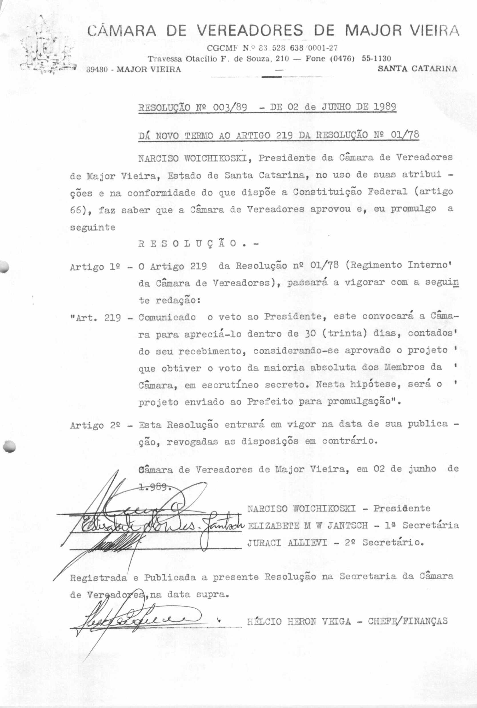 RES 3/1989 - RESOLUÇÃO PROMULGADA