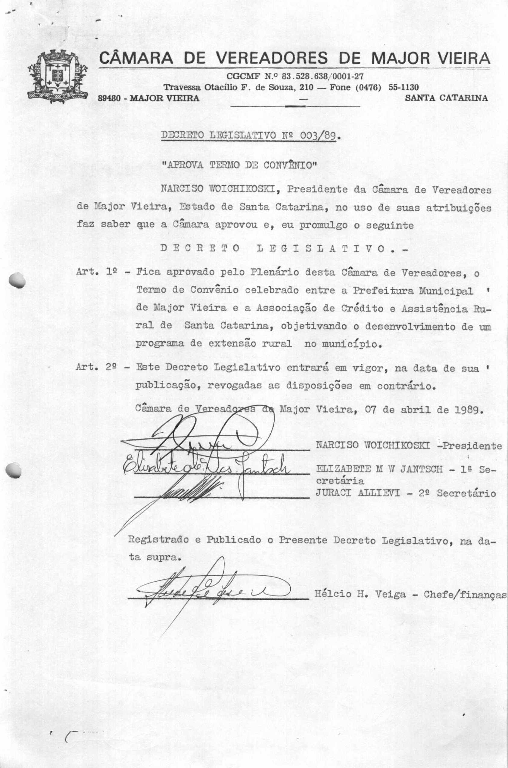 Ementa: APROVA TERMO DE CONVÊNIO CELEBRADO COM A ASSOCIAÇÃO DE CRÉDITO E ASSISTÊNCIA RURAL DE SANTA CATARINA, OBJETIVANDO O DESENVOLVIMENTO DE UM PROGRAMA DE EXTENSÃO RURAL NO MUNICÍPIO.