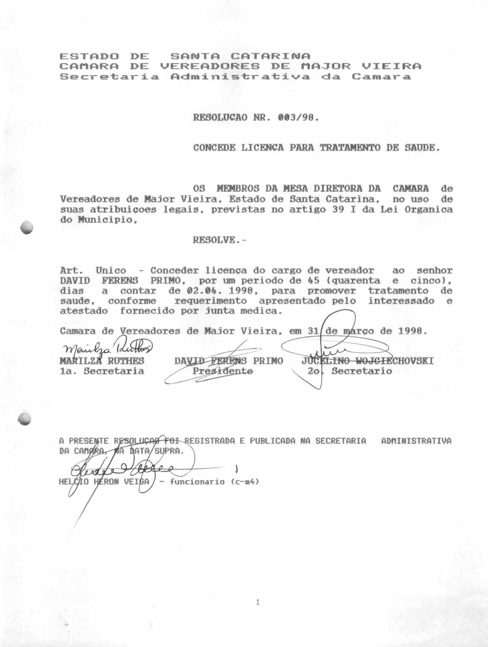 Ementa: CONCEDE LICENÇA AO SERVIDOR DAVID FERENS PRIMO, PARA TRATAMENTO DE SAÚDE.