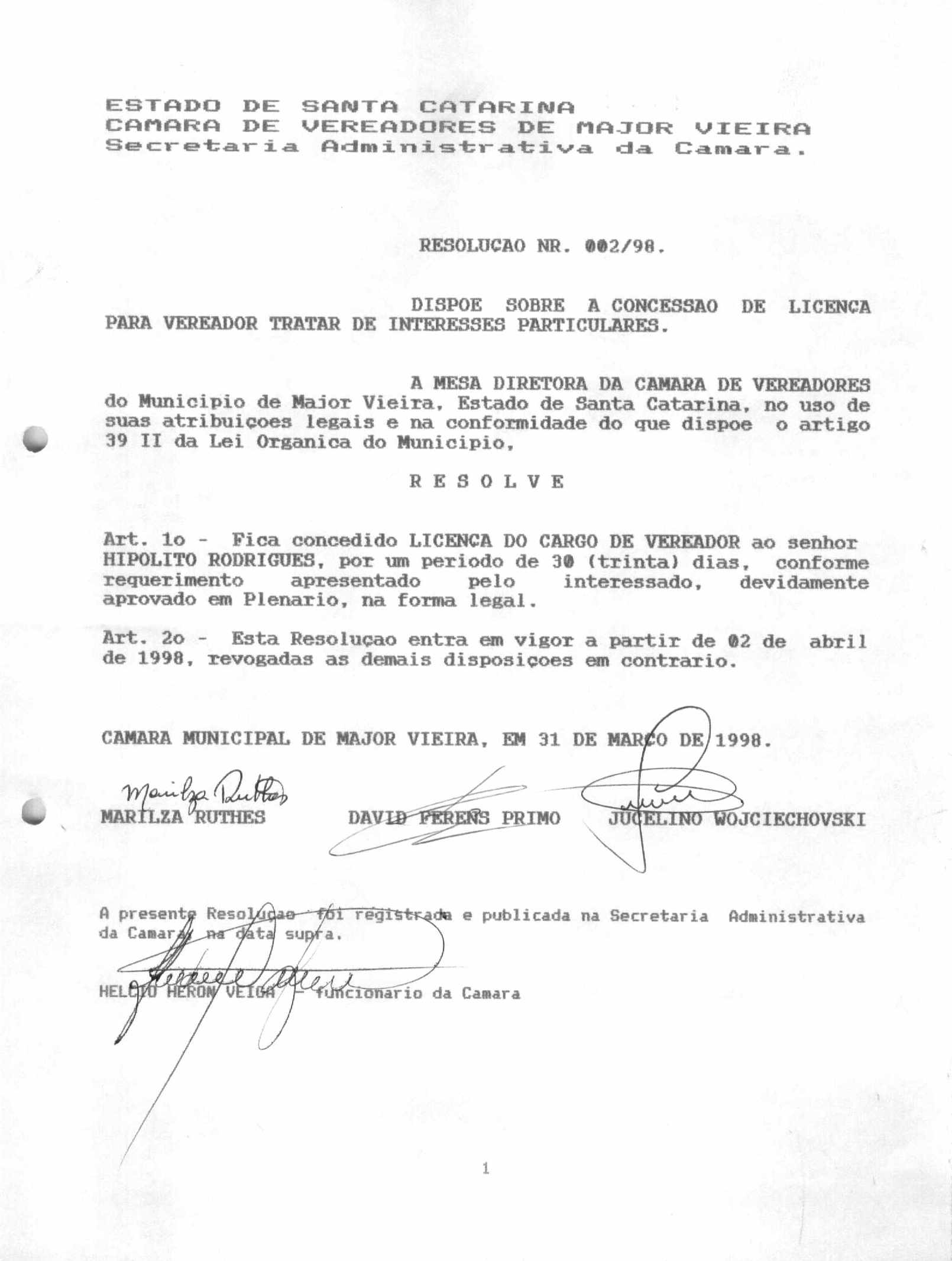 Ementa: CONCEDE LICENÇA DO CARGO DE VEREADOR AO SERVIDOR HIPOLITO RODRIGUES, EM VIRTUDE DE SUA NOMEAÇÃO PARA O CARGO DE EM COMISSÃO, NA ADMINISTRAÇÃO PÚBLICA MUNICIPAL.