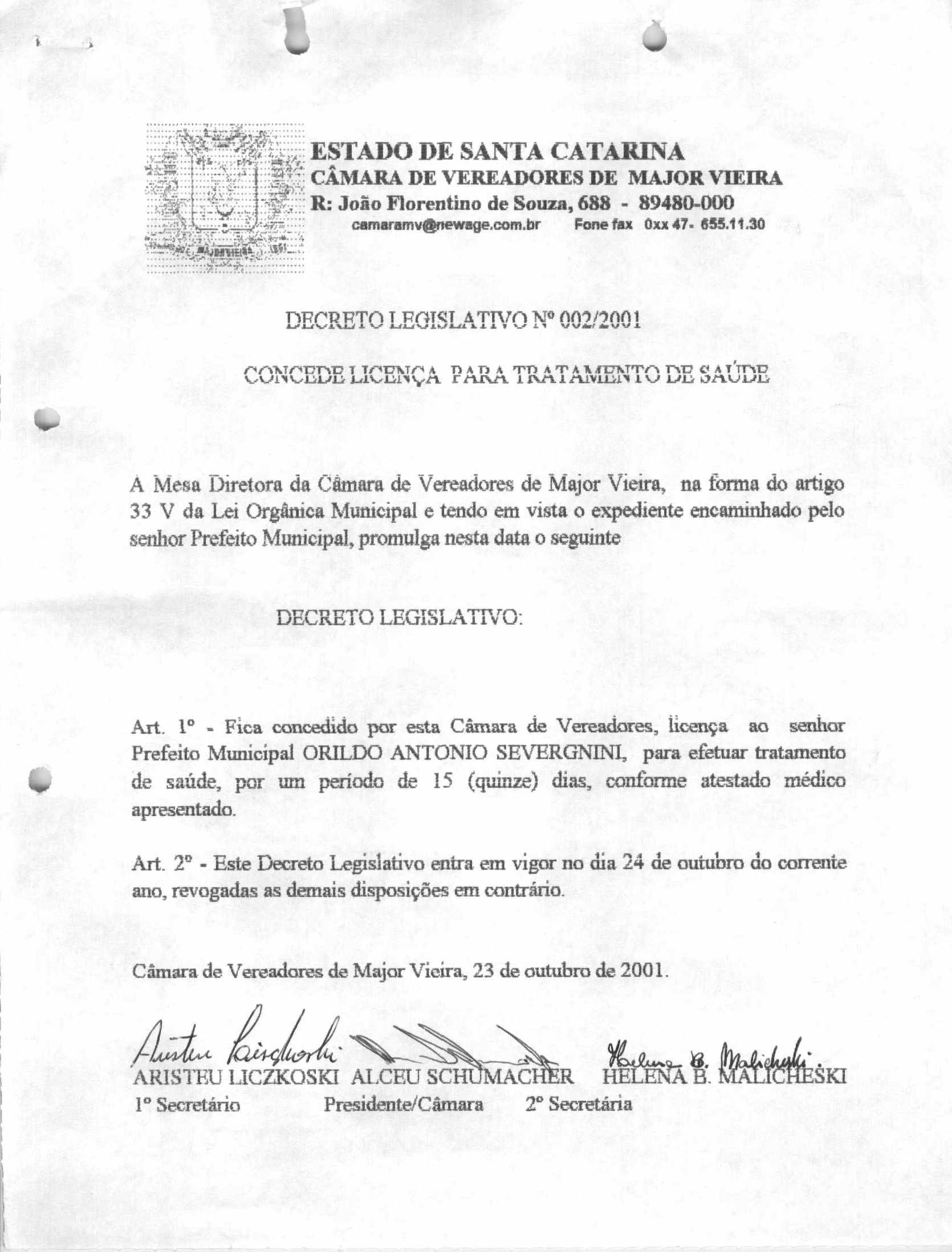 Ementa: CONCEDE LICENÇA PARA TRATAMENTO DE SAÚDE AO PREFEITO, SR. ORILDO ANTONIO SEVERGNINI.