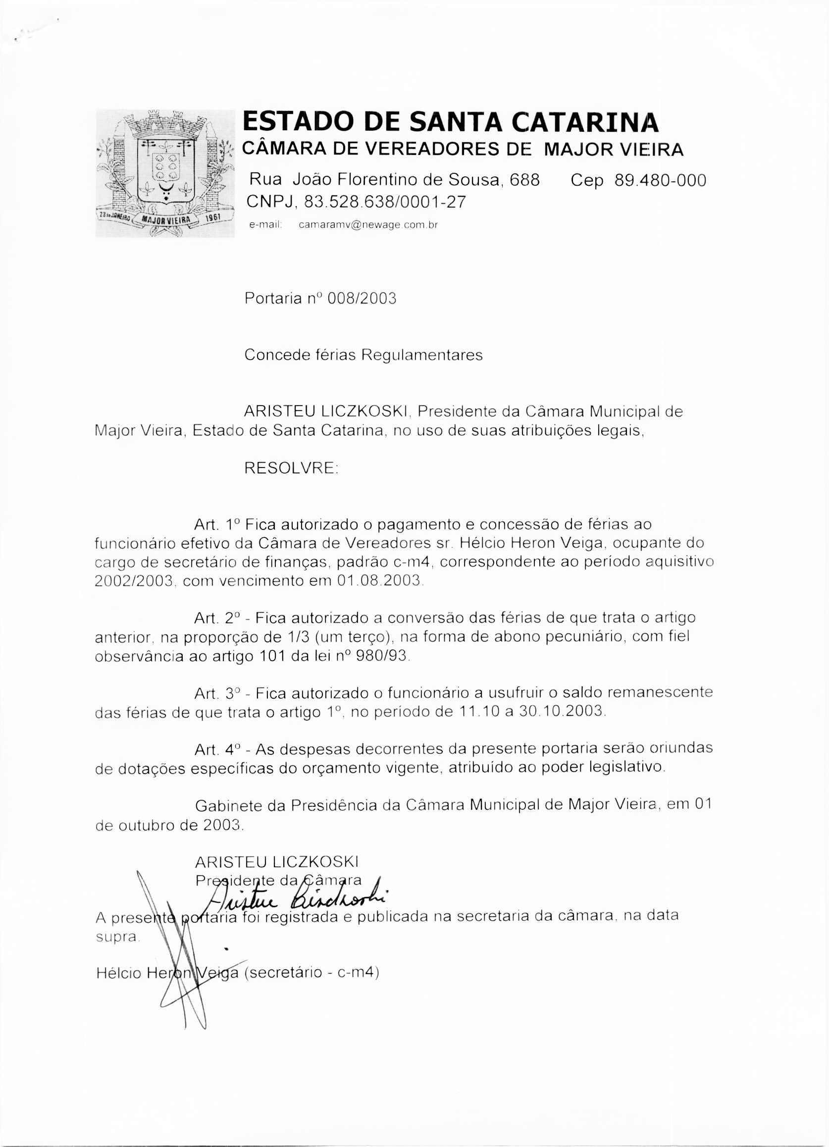 Ementa: AUTORIZAÇÃO A PRORROGAÇÃO DA VIGENCIA DE CONVENIO FIRMADO ENTRE TRIBUNAL DE JUSTIÇA DE SANTA CATARINA E O MUNICIPIO DE MAJOR VIERA.
