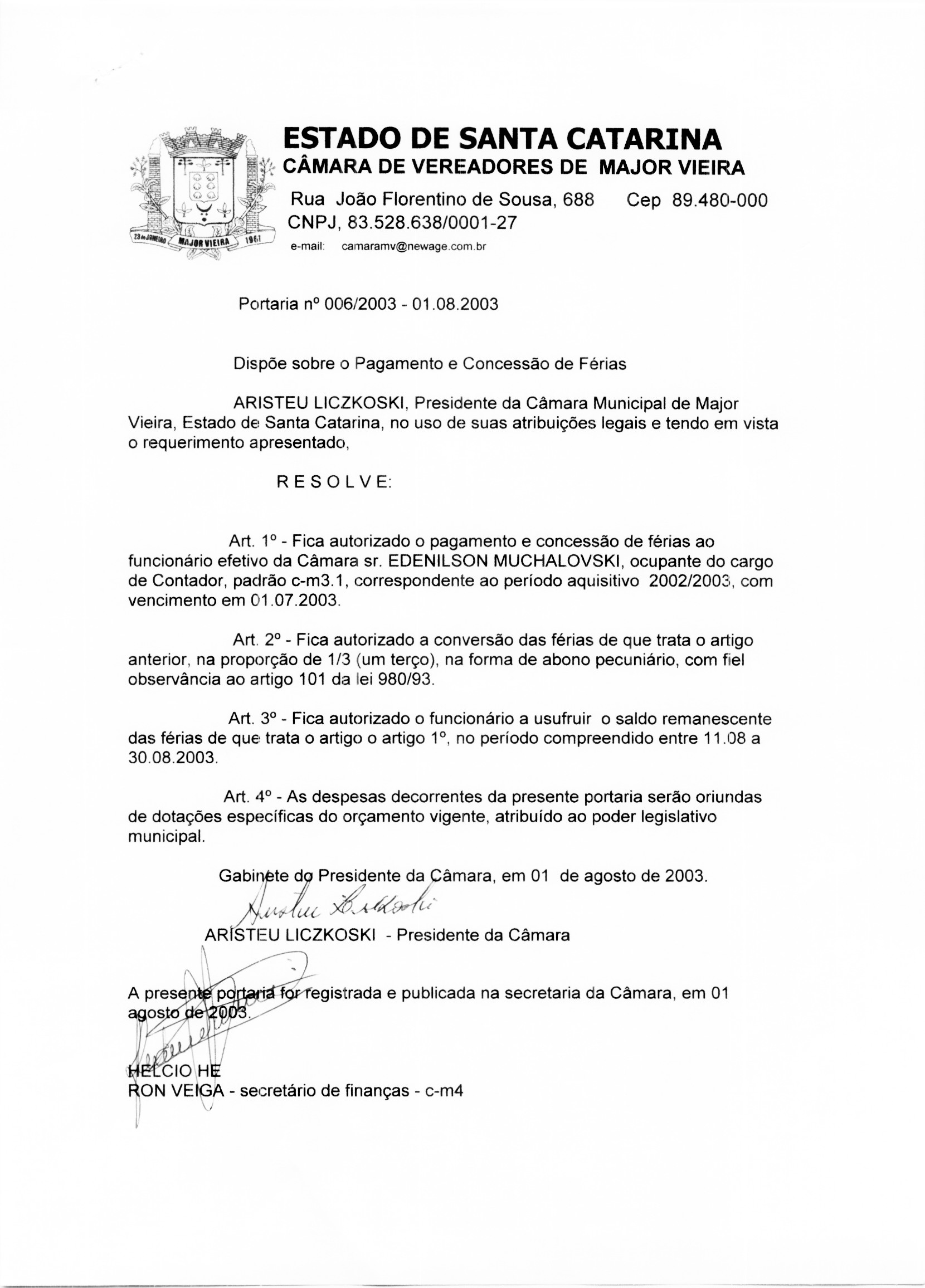Ementa: AUTORIZA O PAGAMENTO PECUNIÁRIO DE 1/3 DAS FÉRIAS E CONCEDE FÉRIAS AO SERVIDOR EDENILSON MUCHALOVSKI, OCUPANTE DO CARGO DE CONTADOR.
