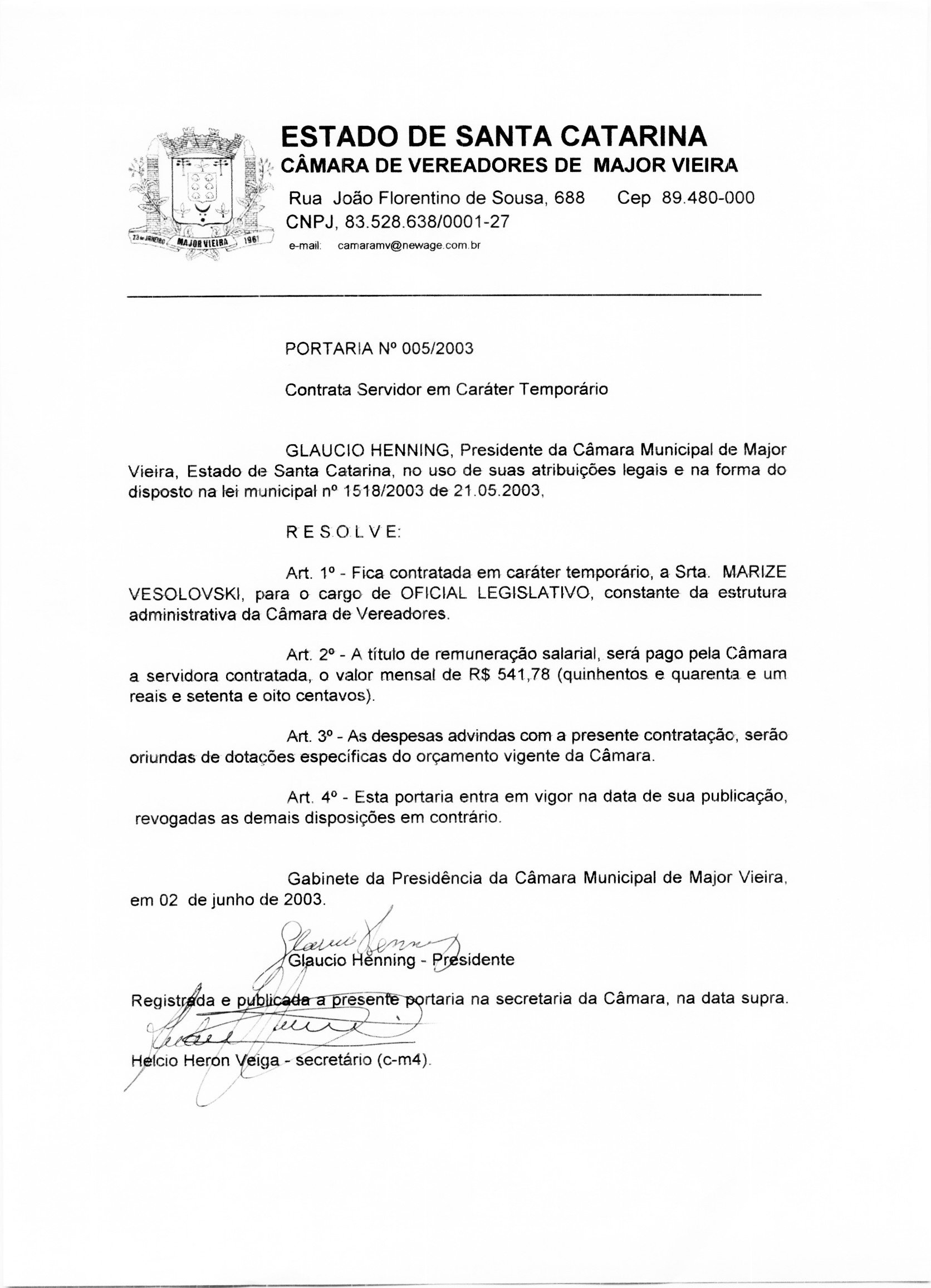Ementa: CONTRATA TEMPORARIAMENTE A SERVIDORA MARIZE VESOLOVSKI, PARA O CARGO DE OFICIAL LEGISLATIVO.