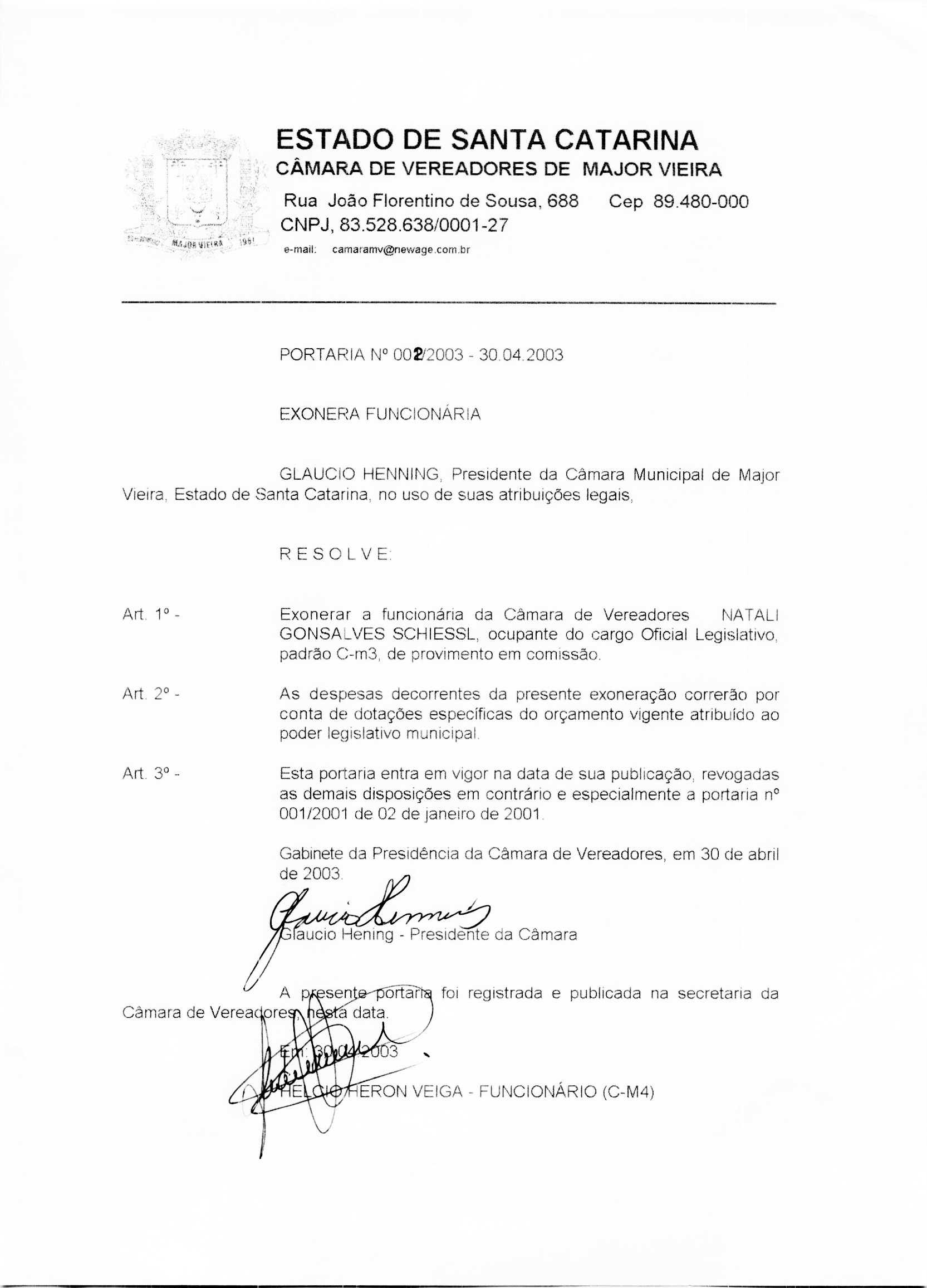 Ementa: REVOGA PORTARIA N° 003/2003, QUE CONTRATA TEMPORARIAMENTE A SERVIDORA NATALI GONSALVES SCHIESSL, PARA OCUPAR O CARGO DE OFICIAL LEGISLATIVO.