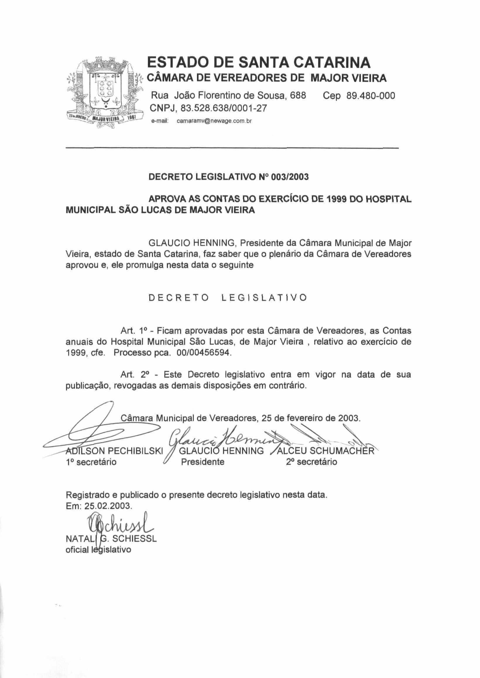 Ementa: APROVA AS CONTAS DO EXERCÍCIO DE 1999, DO HOSPITAL MUNICIPAL SÃO LUCAS DE MAJOR VIEIRA.