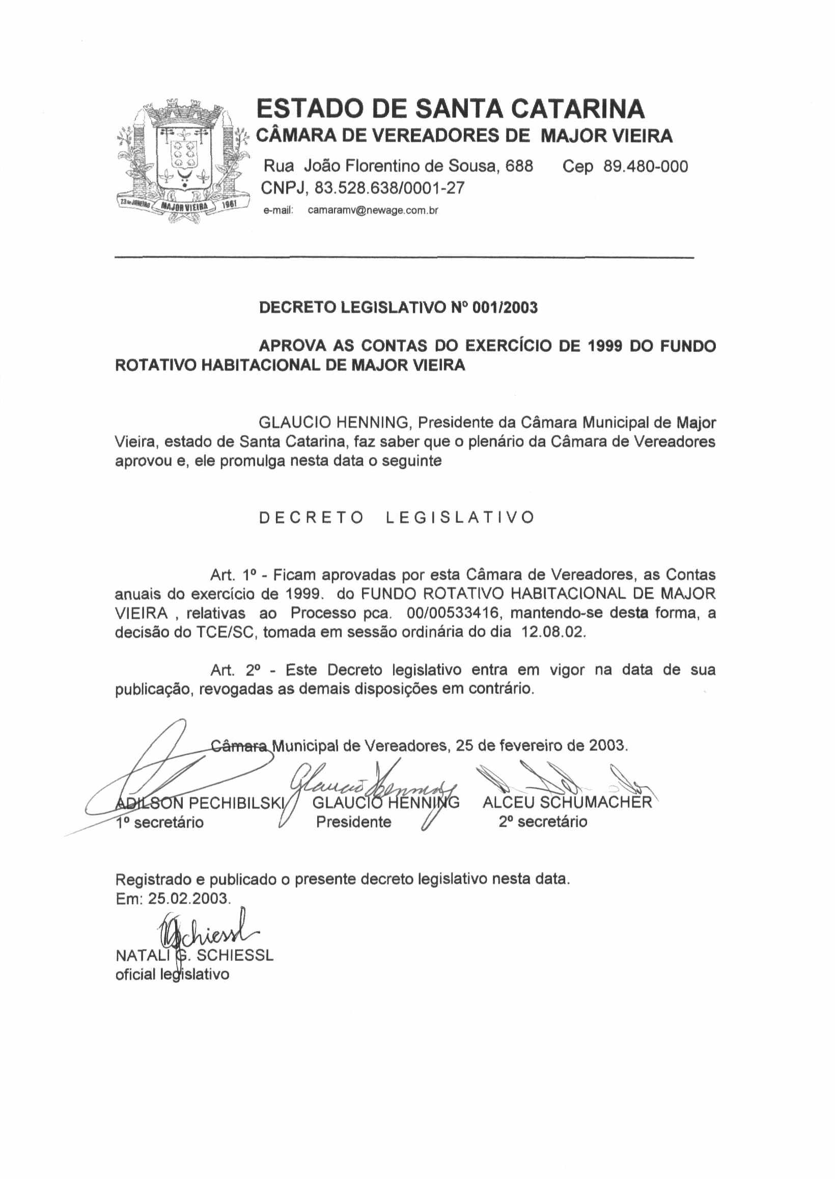Ementa: APROVA AS CONTAS DO EXERCÍCIO DE 1999, DO FUNDO ROTATIVO HABITACIONAL DE MAJOR VIEIRA.