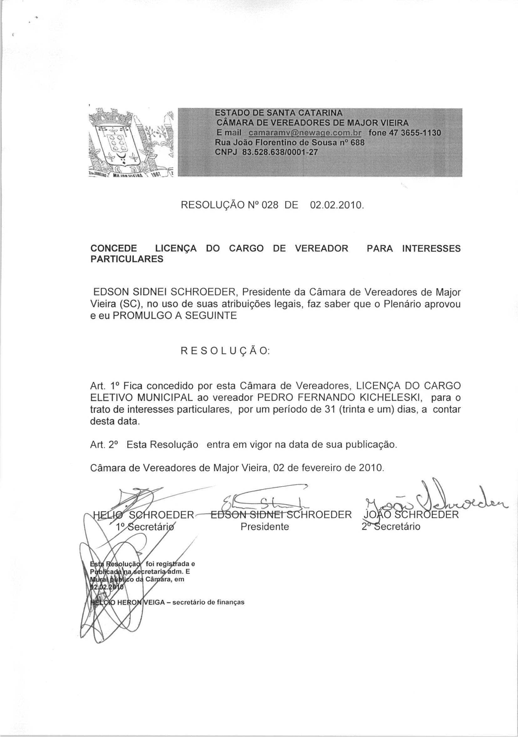 Ementa: CONCEDE LICENÇA PARA TRATAR DE ASSUNTOS PARTICULARES AO VEREADOR PEDRO FERNANDO KICHELESKI.
