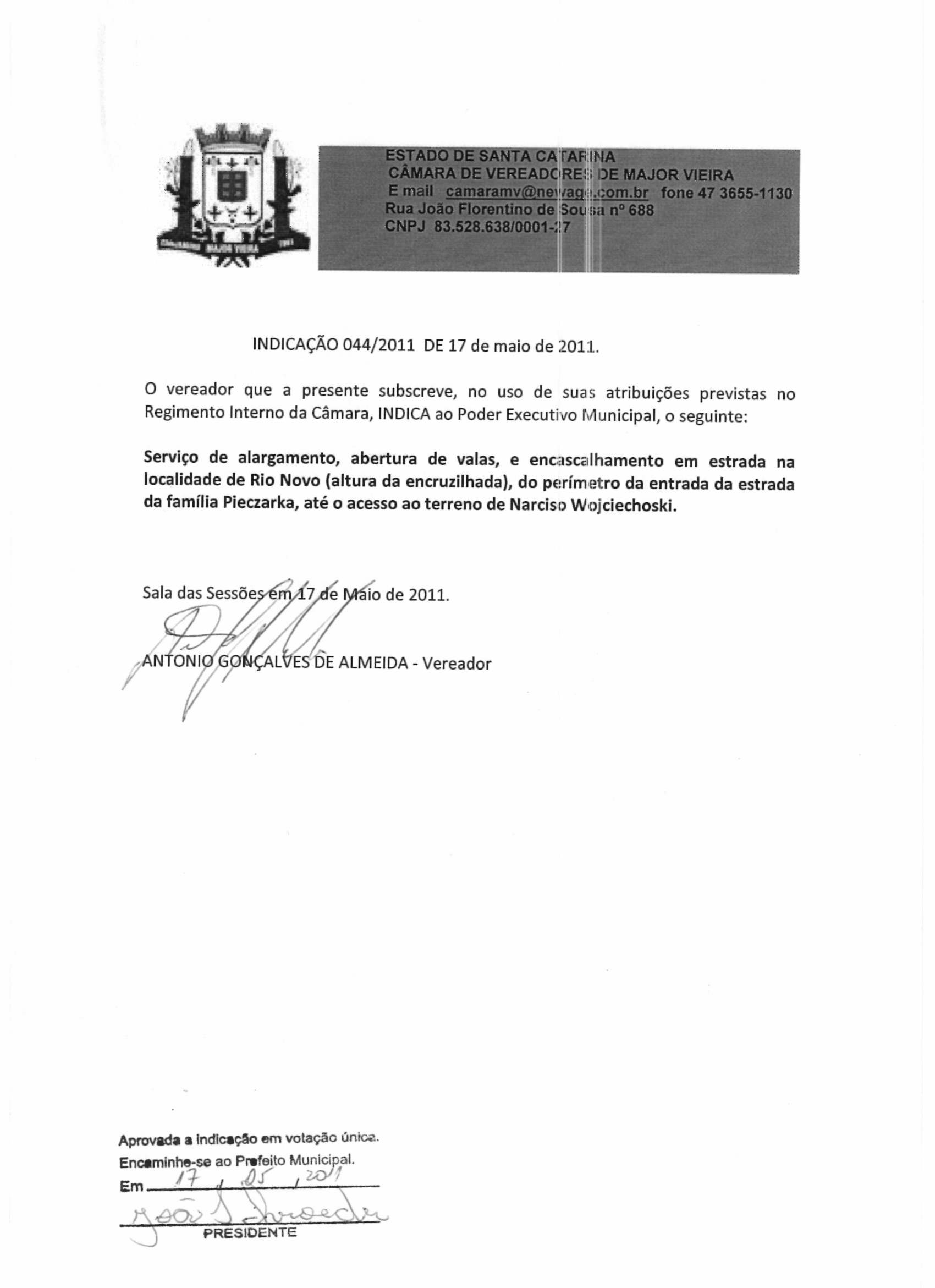 Ementa: SERVIÇO DE ALARGAMENTO, ABERTURA DE VALAS, E ENCASCALHAMENTO EM ESTRADA NA LOCALIDADE DE RIO NOVO (ALTURA DA ENCRUZILHADA), DO PERÍMETRO DA ENTRADA DA ESTRADA DA FAMÍLIA PIECZARKA, ATÉ O ACESSO AO TERRENO DE NARCISO WOJCIECHOSKI.