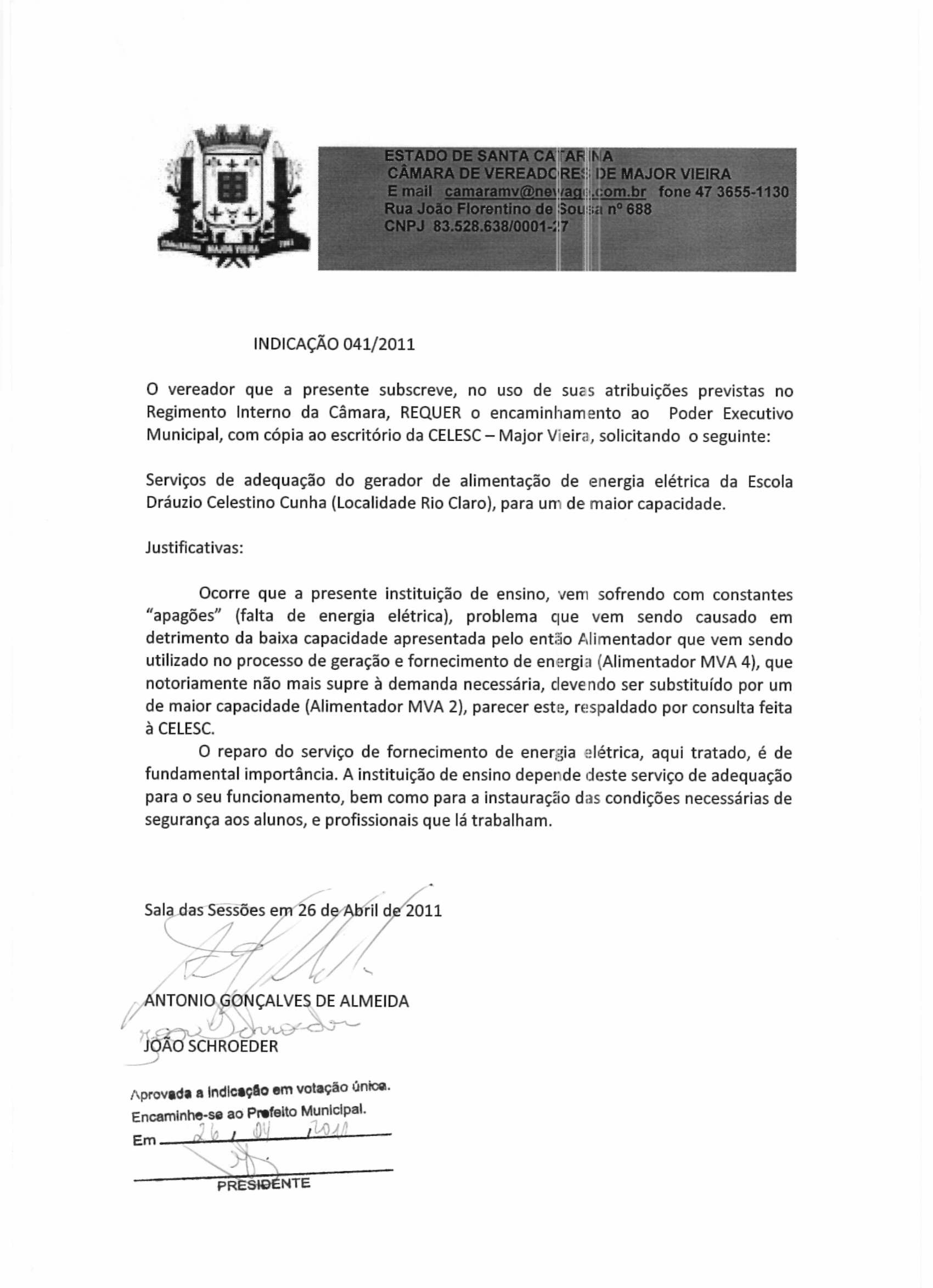 Ementa: SERVIÇO DE ADEQUAÇÃO DO GERADOR DE ALIMENTAÇÃO DE ENERGIA ELÉTRICA DA ESCOLA DRÁUSIO CELESTINO CUNHA (LOCALIDADE RIO CLARO), PARA UM DE MAIOR CAPACIDADE.