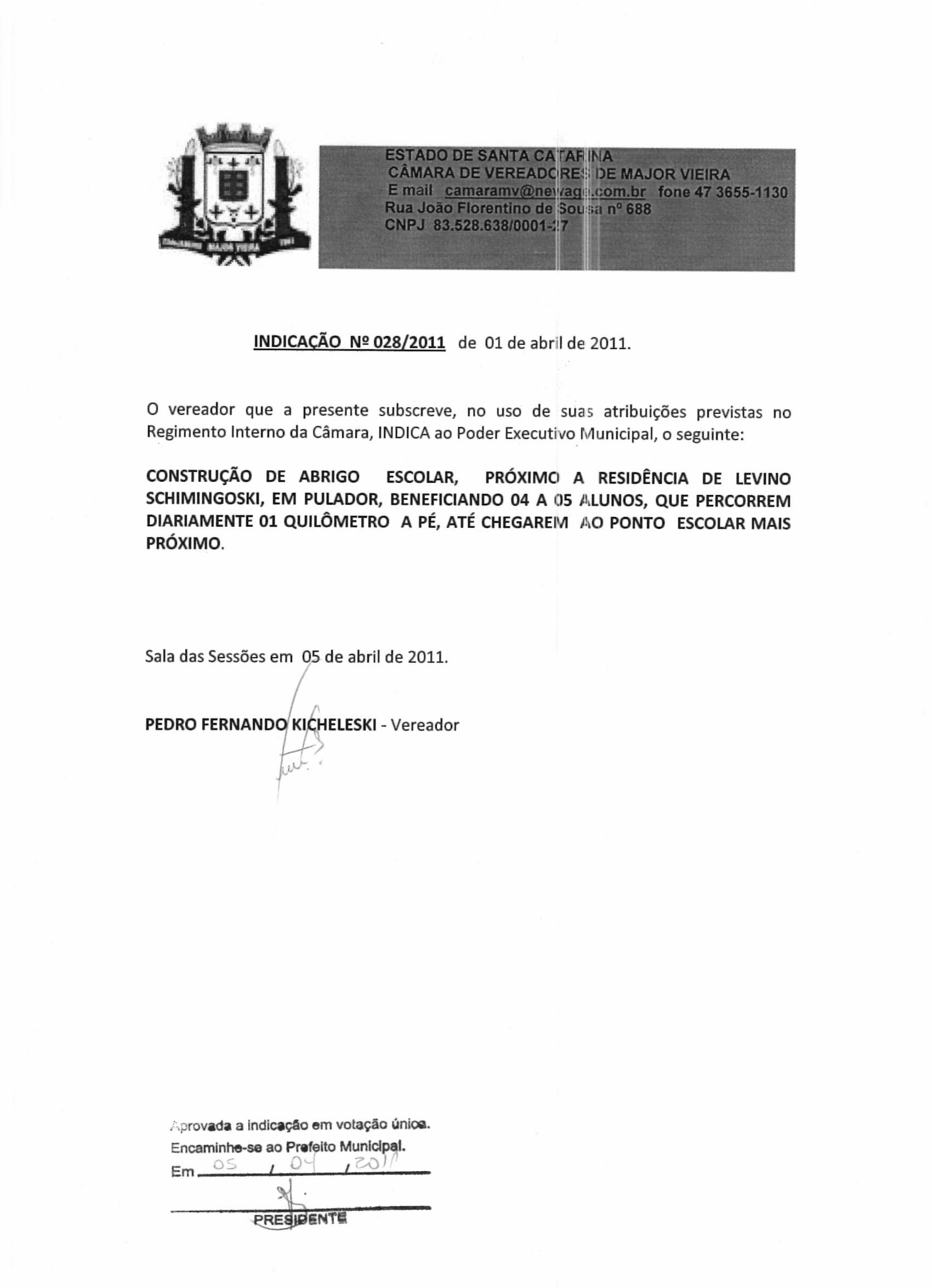 Ementa: CONSTRUÇÃO DE ABRIGO PARA USO ESCOLAR, PRÓXIMO A RESIDÊNCIA DE LEVINO SCHIMINGOSKI, EM PULADOR, BENEFICIANDO 04 A 05 ALUNOS, QUE PERCORREM DIARIAMENTE 01 QUILÔMETRO A PÉ, ATÉ CHEGAREM O PONTO ESCOLAR MAIS PRÓXIMO.