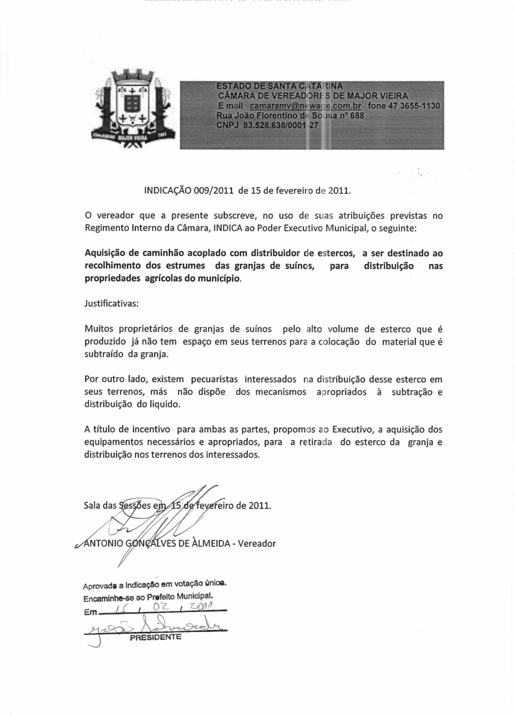 Ementa: AQUISIÇÃO DE CAMINHÃO TANQUE, DESTINADO AO RECOLHIMENTO DE ESTERCOS DAS GRANJAS DE SUINOS E CONSEQUENTE DISTRIBUIÇÃO DO NAS PROPRIEDADES AGRÍCOLAS DO MUNICÍPIO.