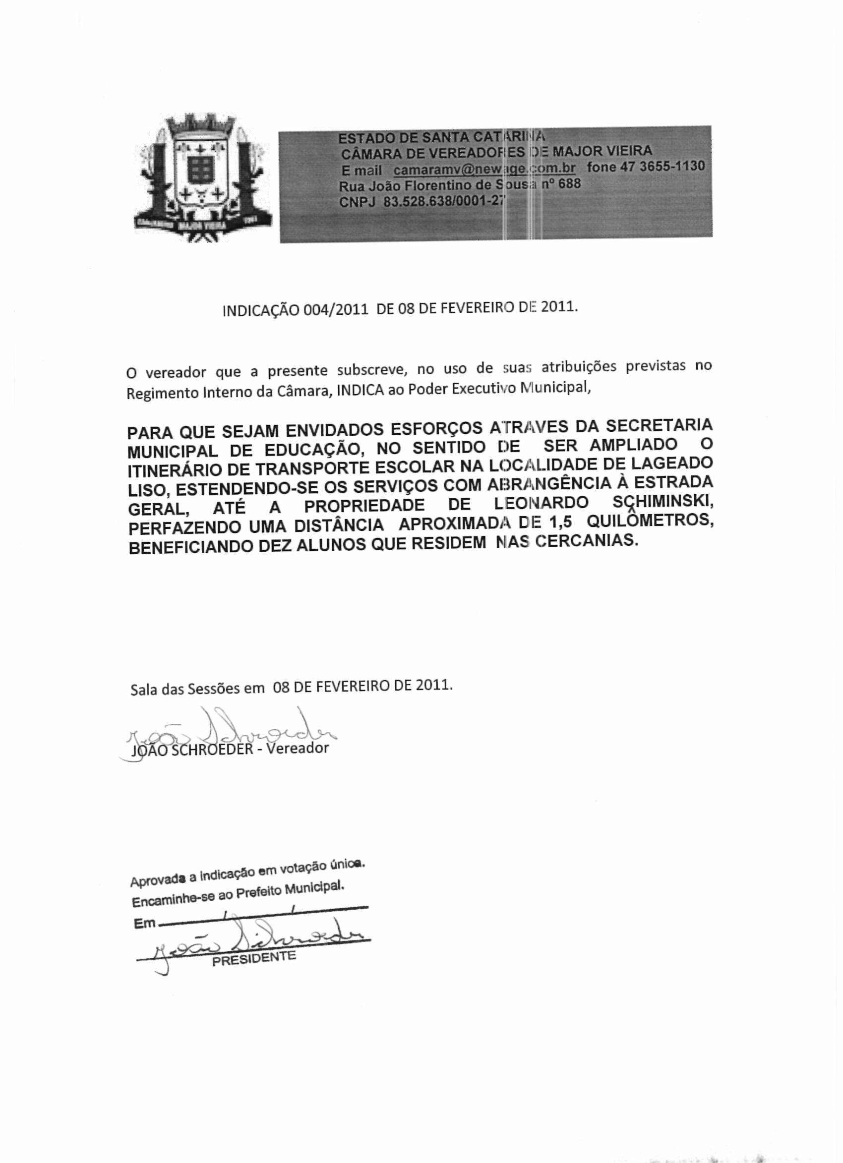 Ementa: SOLICITA AO PODER EXECUTIVO MUNICIPAL PARA QUE SEJAM ENVIDADOS ESFORÇOS ATRAVES DA SECRETARIA MUNICIPAL DE EDUCAÇÃO, NO SENTIDO DE SER AMPLIADO O ITINERÁRIO DE TRANSPORTE ESCOLAR NA LOCALIDADE DE LAGEADO LISO, ESTENDENDO-SE OS SERVIÇOS COM ABRANGÊNCIA À ESTRADA GERAL, ATÉ A PROPRIEDADE DE LEONARKO SCHIMINSKI, PERFAZENDO UMA DISTÂNCIA APROXIMADA DE 1,5 QUIILÔMETROS, BENEFICIANDO DEZ ALUNOS QUE RESIDEM NAS CERCANIAS.