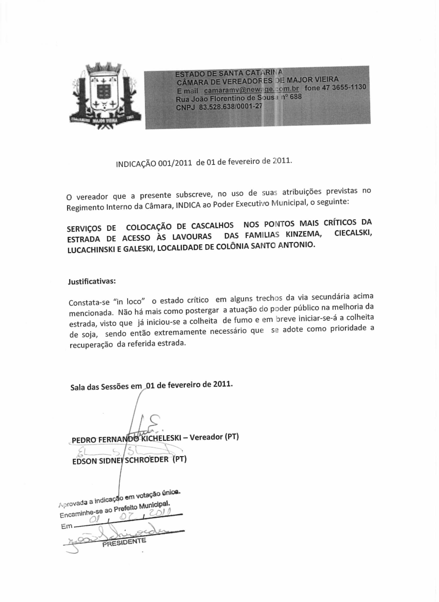 Ementa: SERVIÇOS DE COLOCAÇÃO DE CASCALHOS NOS PONTOS MAIS CRÍTICOS DA ESTRADA DE ACESSO ÀS LAVOURAS DAS FAMILIAS KINZEMA, CIECALSKI, LUCACHINSKI E GALESKI, LOCALIDADE DE COLÔNIA SANTO ANTONIO.