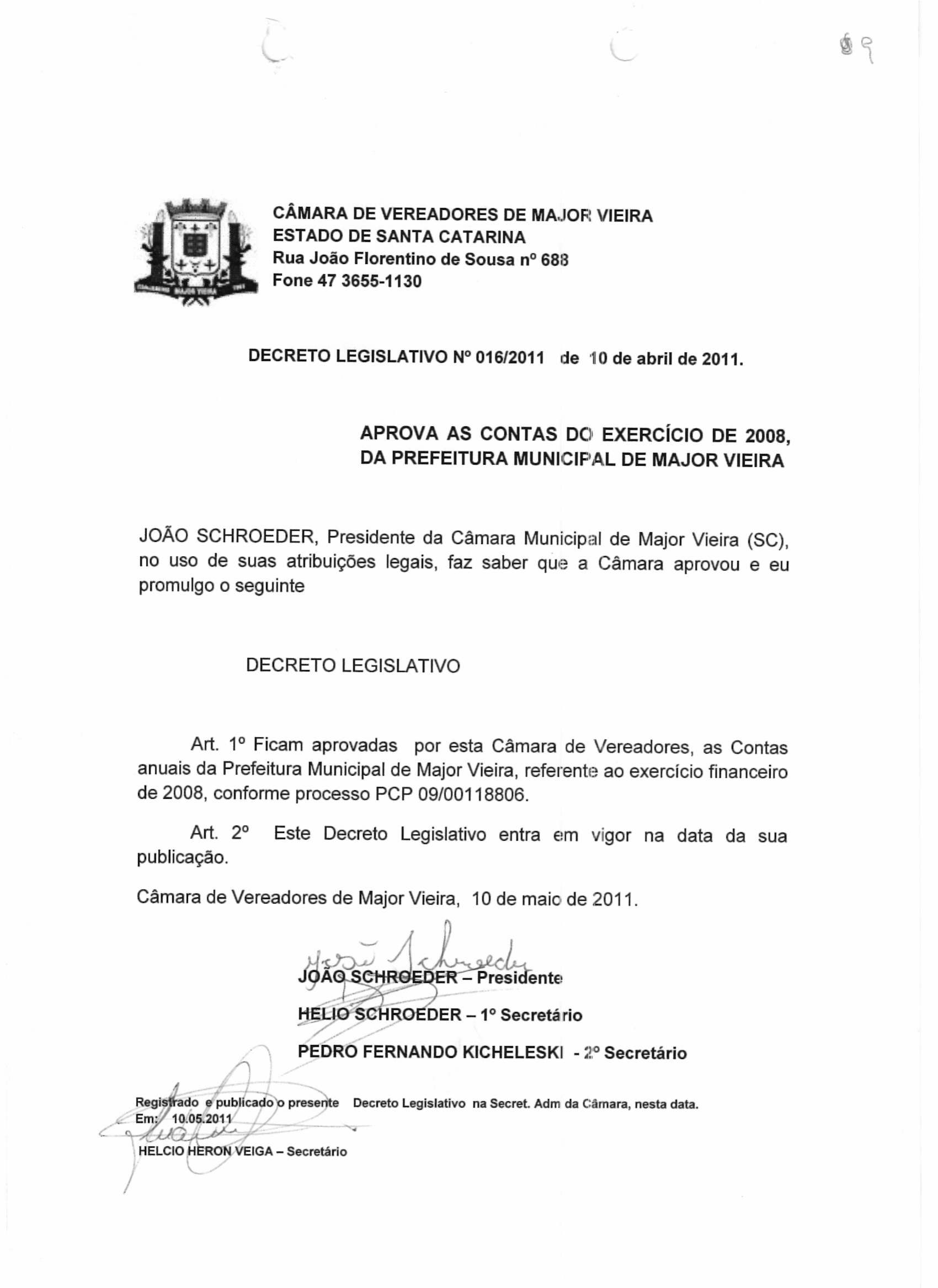 Ementa: APROVA AS CONTAS DO EXERCÍCIO DE 2008, DA PREFEITURA MUNICIPAL DE MAJOR VIEIRA