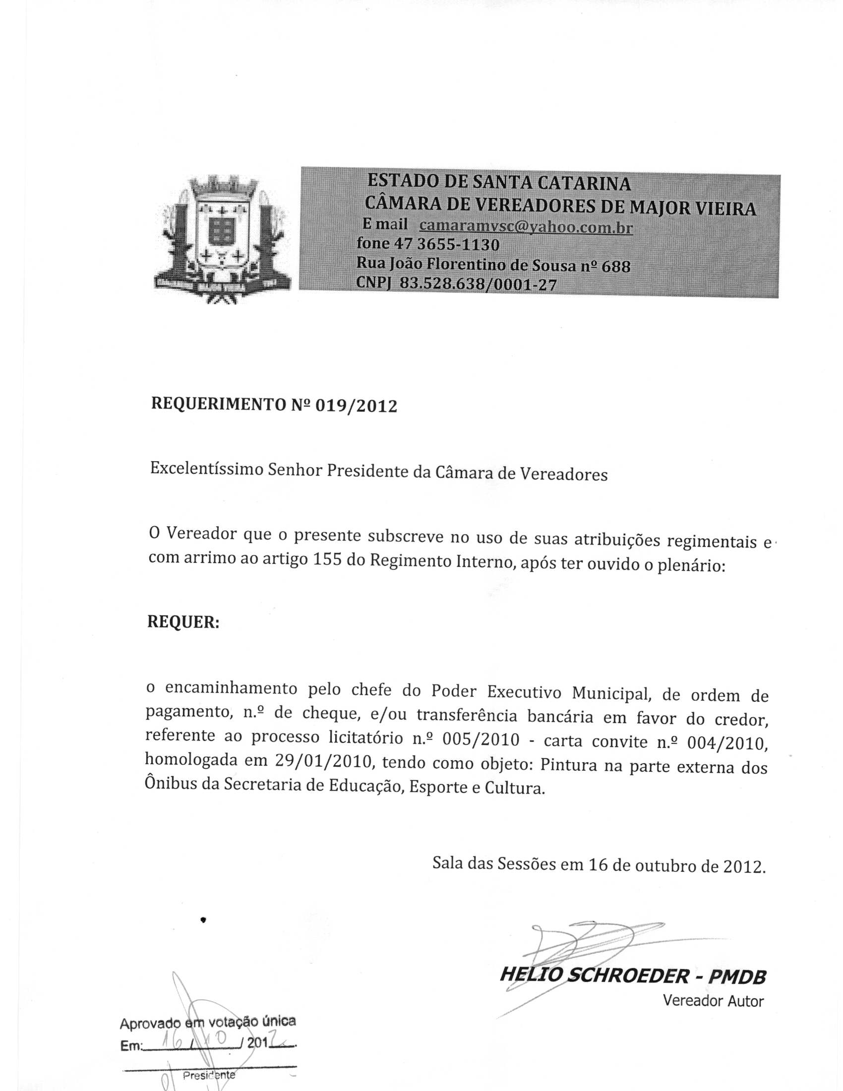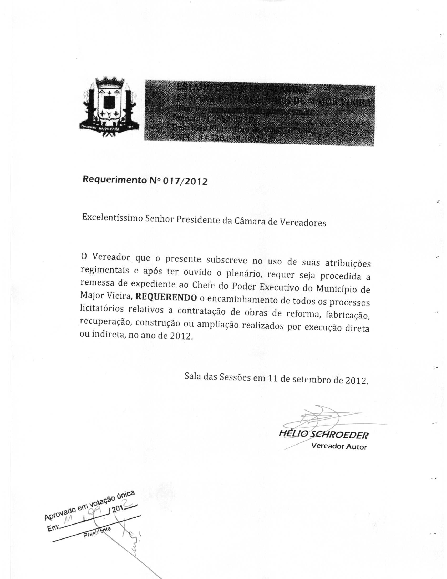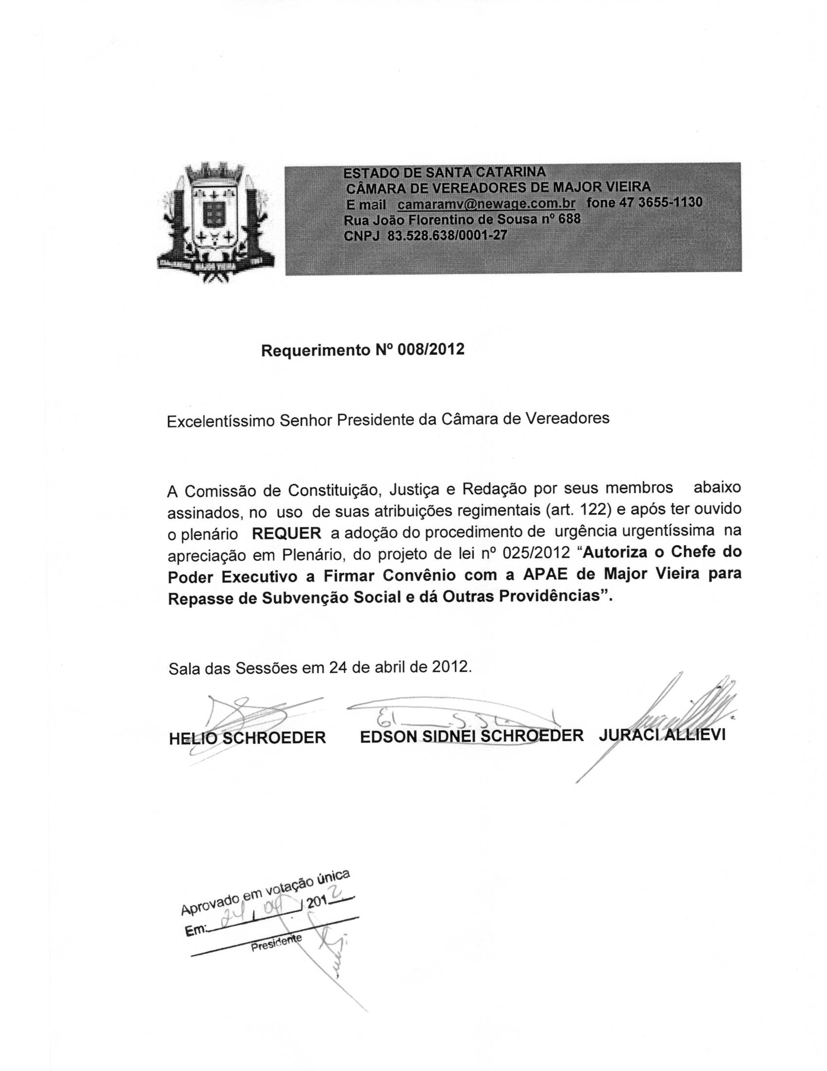Ementa: REQUER URGÊNCIA NA APRECIAÇÃO DO PROJETO DE LEI Nº 025/2012 "AUTORIZA O CHEFE DO PODER EXECUTIVO A FIRMAR CONVÊNIO COM A APAE DE MAJOR VIEIRA PARA REPASSE DE SUBVENÇÃO SOCIAL E DÁ OUTRAS PROVIDÊNCIAS".