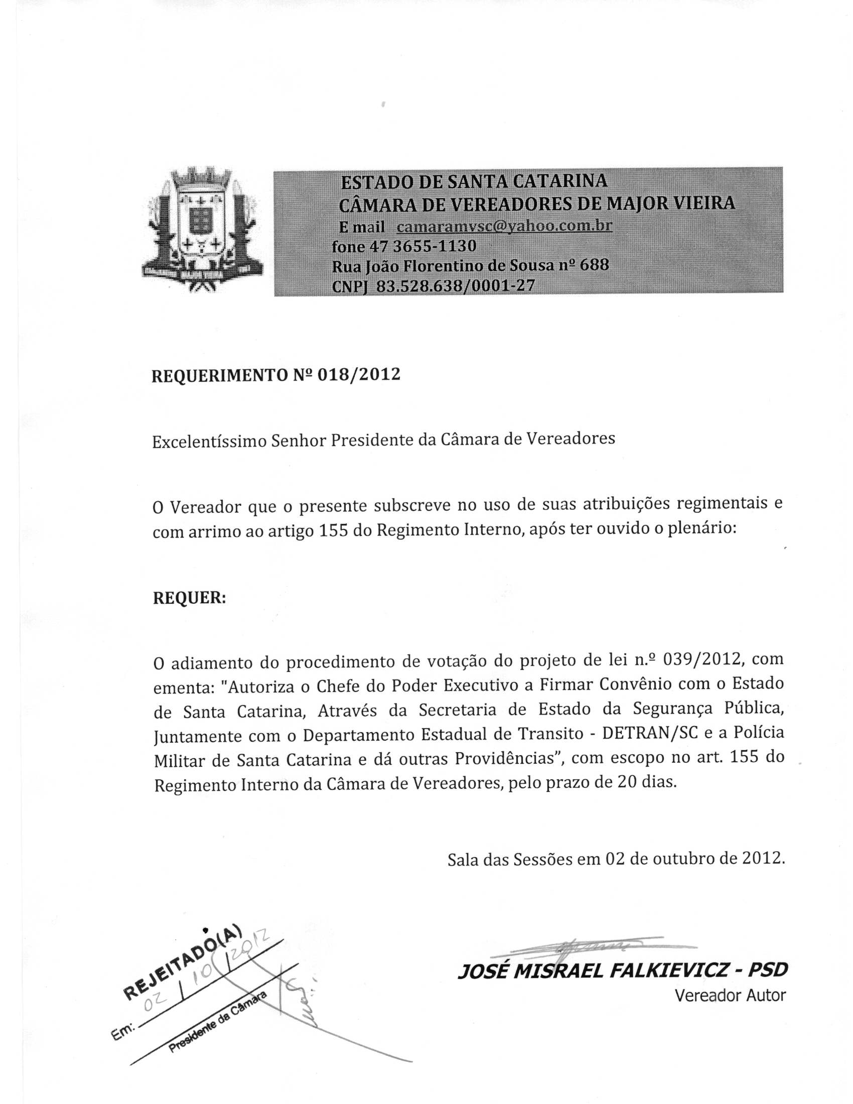 Ementa: REQUER O ADIAMENTO DO PROCEDIMENTO DE VOTAÇÃO DO PROJETO DE LEI N.º 039/2012, COM ESCOPO NO ART. 155, DO REGIMENTO INTERNO DA CÂMARA DE VEREADORES.