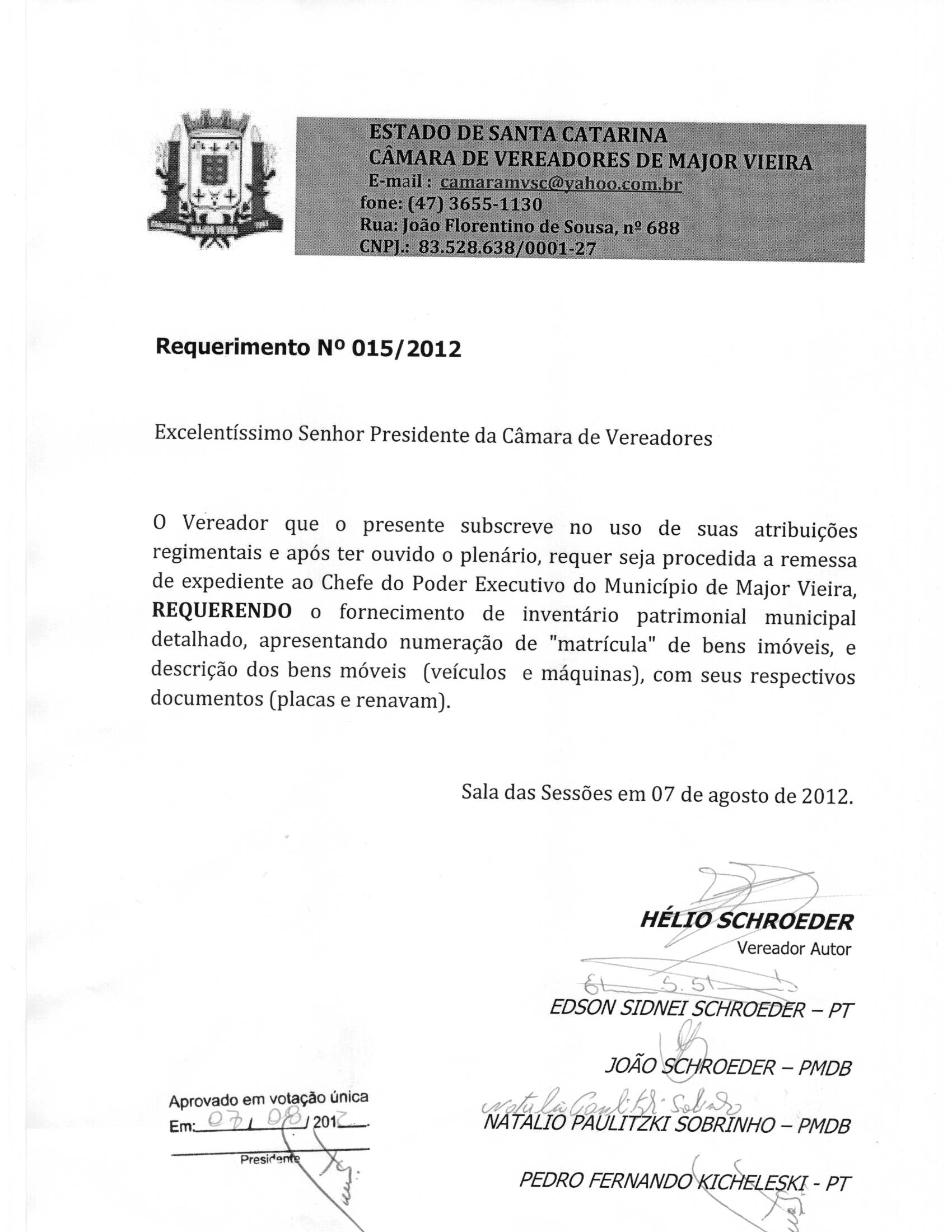 Ementa: REQUER AO PODER EXECUTIVO O FORNECIMENTO DE INVENTÁRIO PATRIMONIAL MUNICIPAL DETALHADO, APRESENTANDO NUMERAÇÃO DE "MATRÍCULA" DE BENS IMÓVEIS, E DESCRIÇÃO DOS VEÍCULOS (MÁQUINAS E AUTOMÓVEIS), COM SEUS RESPECTIVOS DOCUMENTOS (PLACAS E RENAVAM).